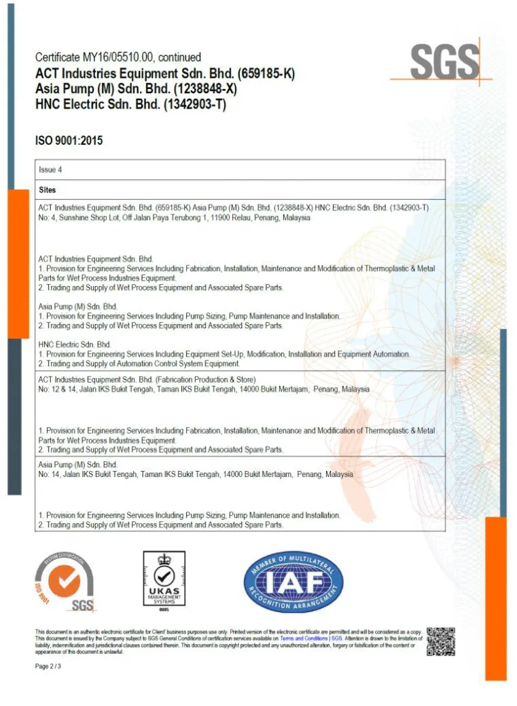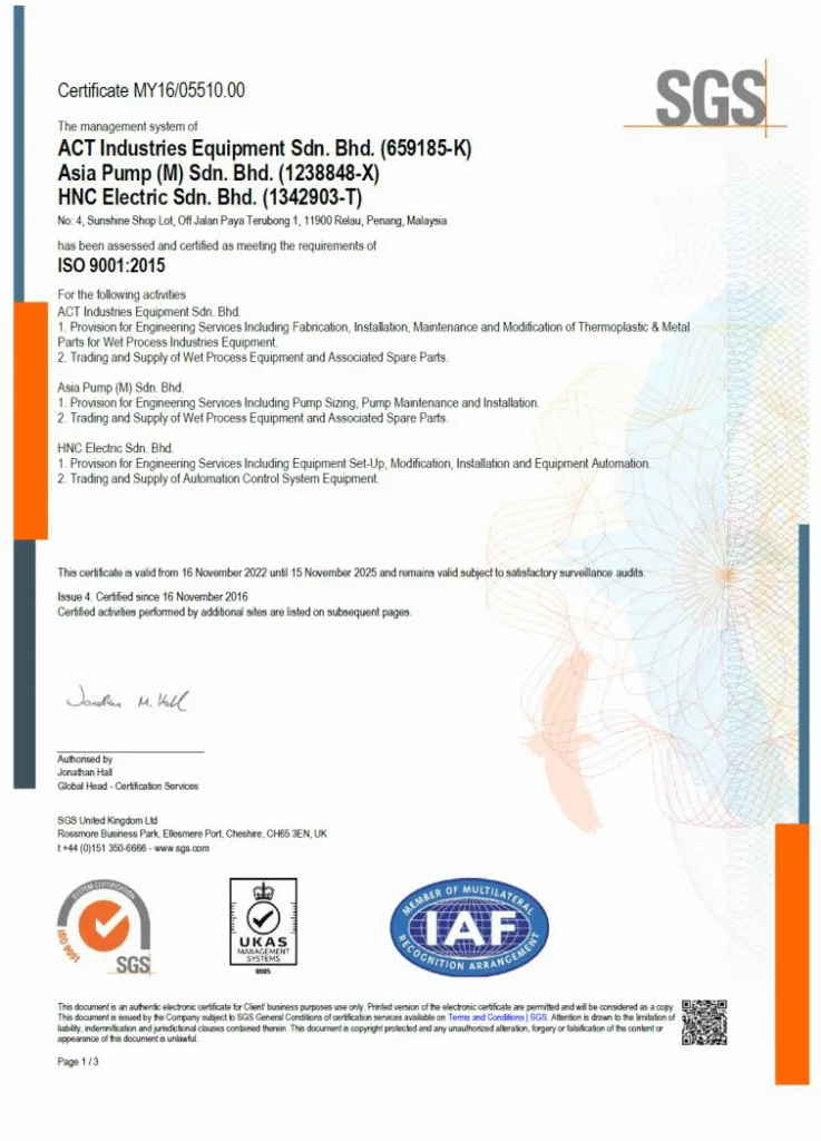 ACT business started off as a engineering firm, supply chemical pumps and plating industry equipment spare parts. The business nature was transformed into wet process equipment manufacturing and service provider since year 2010. ACT was given the Asia Pump distributorship from the manufacturer in 2017, the Asia Pump (M) Sdn. Bhd. was setup as a sister company since then.